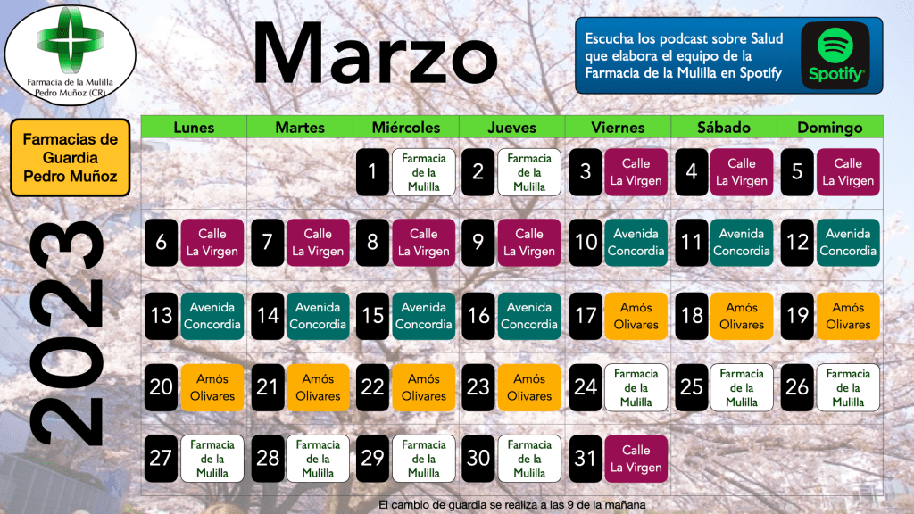 Farmacias de guardia en Pedro Muñoz durante el mes de Marzo de 2023 28 Feb 2023 ~ farmaciadelamulilla Comparte esto: Compartir en X (Se abre en una ventana nueva) X Comparte en Facebook (Se abre en una ventana nueva) Facebook Me gusta Cargando... Relacionado Publicado por farmaciadelamulilla En este espacio trataremos de compartir contenidos con la humilde intención de ayudar a mejorar la salud de nuestros pacientes Ver todas las entradas de farmaciadelamulilla