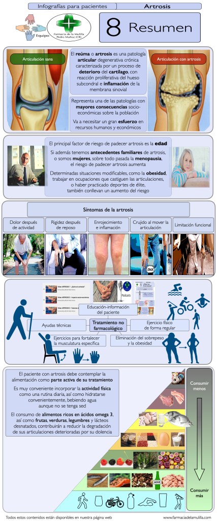 En esta infografía resumimos los puntos que consideramos más interesantes para los pacientes de artrosis, como son la definición de la enfermedad, los factores de riesgo que hacen más probable su aparición, los síntomas, y qué puede hacer el paciente de artrosis para tratar de mejorar su estado, sobre todo desde el punto de vista de las medidas no farmacológicas y la alimentación.