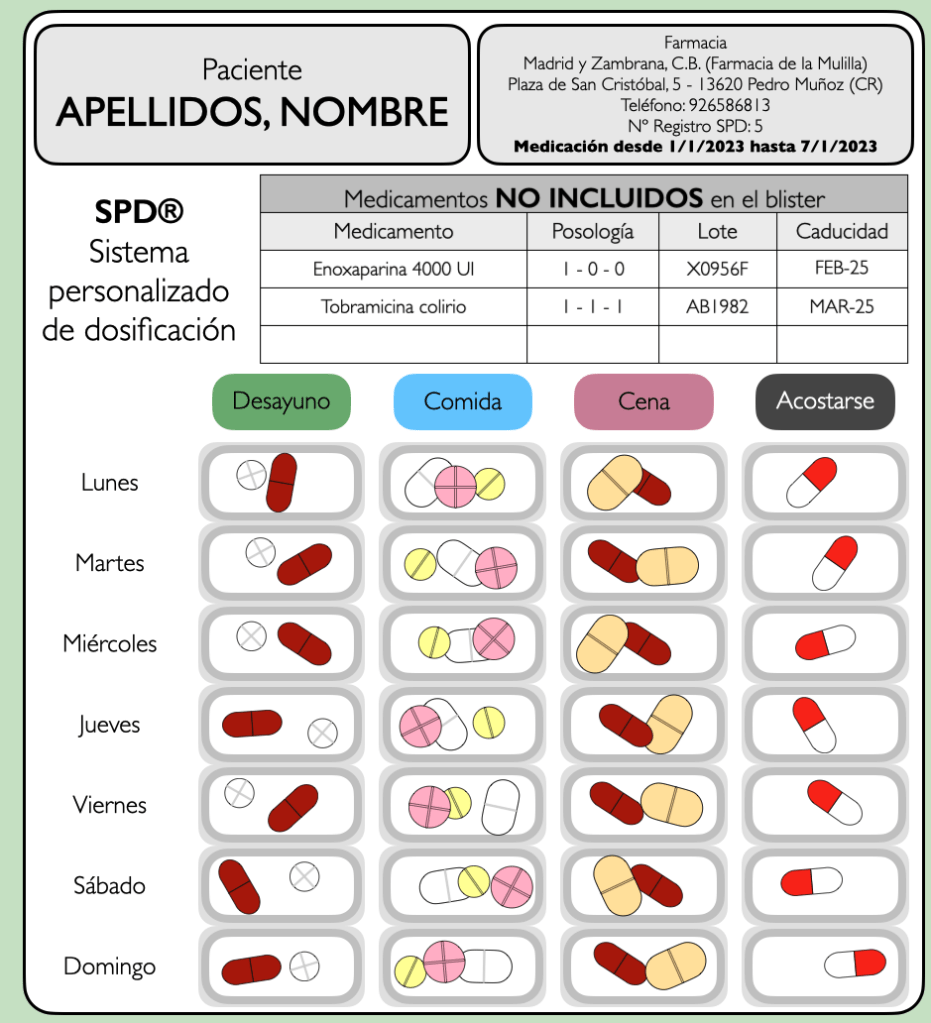 Tenemos en primer lugar la identificación del paciente. Se debe realizar en tamaño de letra grande, para evitar confusiones en la elaboración, y para que el paciente o su cuidador compruebe de quién es la medicación, pues puede darse el caso de que un cuidador tenga a su cargo más de un paciente con este tipo de dispositivos para el control de su medicación.