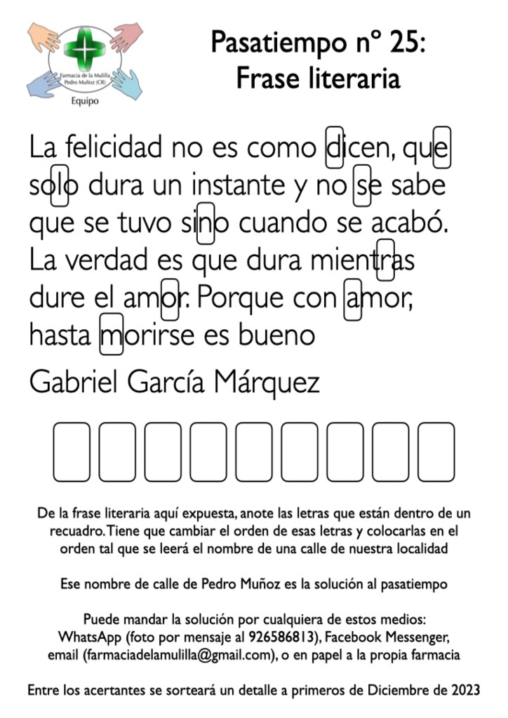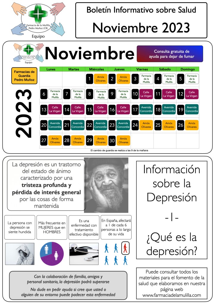Buenos días. Aquí dejamos la información del Boletín del mes de Noviembre, donde podréis consultar las farmacias de guardia en Pedro Muñoz, información sobre la Depresión, y un pasatiempo para ejercitar la mente.